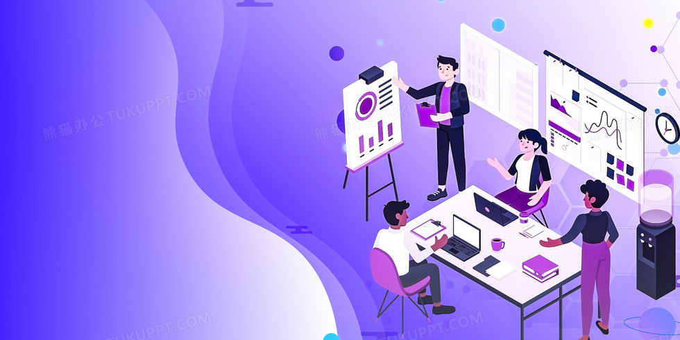 本作品内容为紫色商务办公渐变背景, 格式为 psd, 大小8 MB, 图片尺寸为2362 x 1181, 作品中背景图片无需修改, 源文件无水印,可以直接使用, 欢迎使用熊猫办公。 如认为平台内容涉嫌侵权,可通过邮件:tousu@tukuppt.com提出书面通知,我们将及时处理。