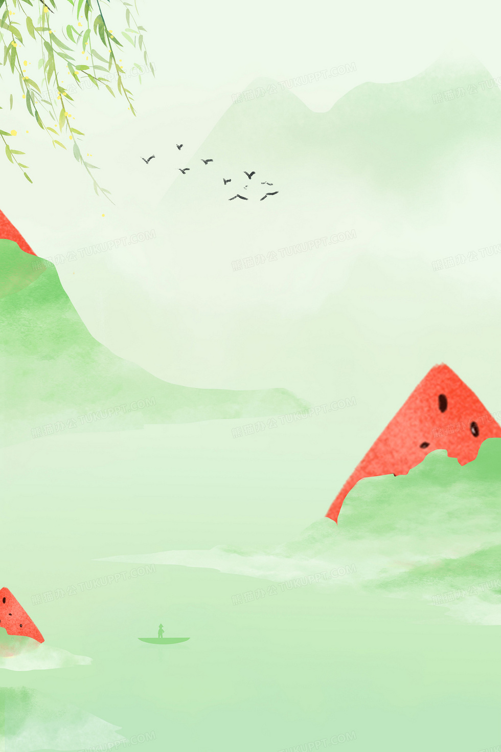 本作品内容为绿色古风水墨夏天西瓜合成背景, 格式为 psd, 大小36 MB, 图片尺寸为3543 x 5314, 作品中背景图片无需修改, 源文件无水印,可以直接使用, 欢迎使用熊猫办公。 如认为平台内容涉嫌侵权,可通过邮件:tousu@tukuppt.com提出书面通知,我们将及时处理。