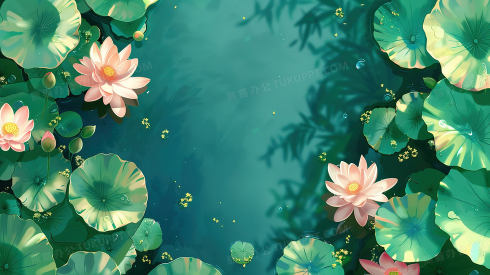 本作品内容为夏日荷花唯美俯视插画风背景, 格式为 jpg, 大小3 MB, 图片尺寸为2912 x 1632, 作品中背景图片无需修改, 源文件无水印,可以直接使用, 欢迎使用熊猫办公。 如认为平台内容涉嫌侵权,可通过邮件:tousu@tukuppt.com提出书面通知,我们将及时处理。