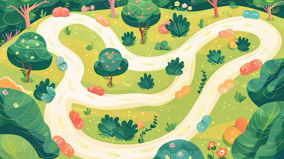 本作品内容为绿色蜿蜒的林间乡村小路插画, 格式为 jpg, 大小3 MB, 图片尺寸为2912 x 1632, 源文件无水印, 欢迎使用熊猫办公。 如认为平台内容涉嫌侵权,可通过邮件:tousu@tukuppt.com提出书面通知,我们将及时处理。