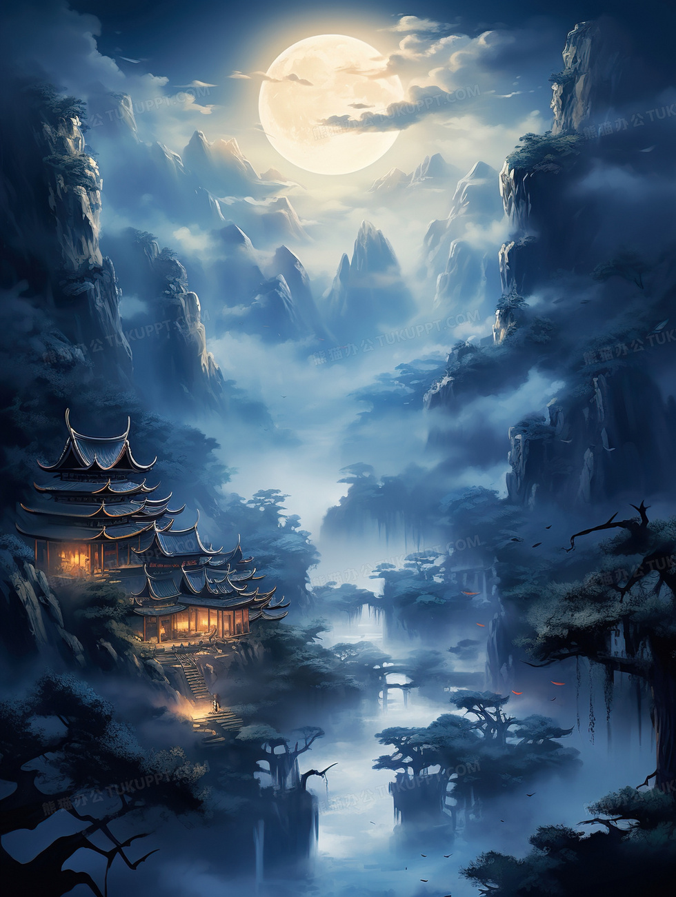 首页 > 插画 > 科技艺术 > 中国风 > 中国风古风山水建筑峡谷插画