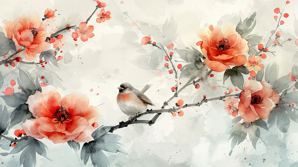 本作品内容为中国风花鸟牡丹花水墨插画, 格式为 jpg, 大小4 MB, 图片尺寸为2912 x 1632, 源文件无水印, 欢迎使用熊猫办公。 如认为平台内容涉嫌侵权,可通过邮件:tousu@tukuppt.com提出书面通知,我们将及时处理。