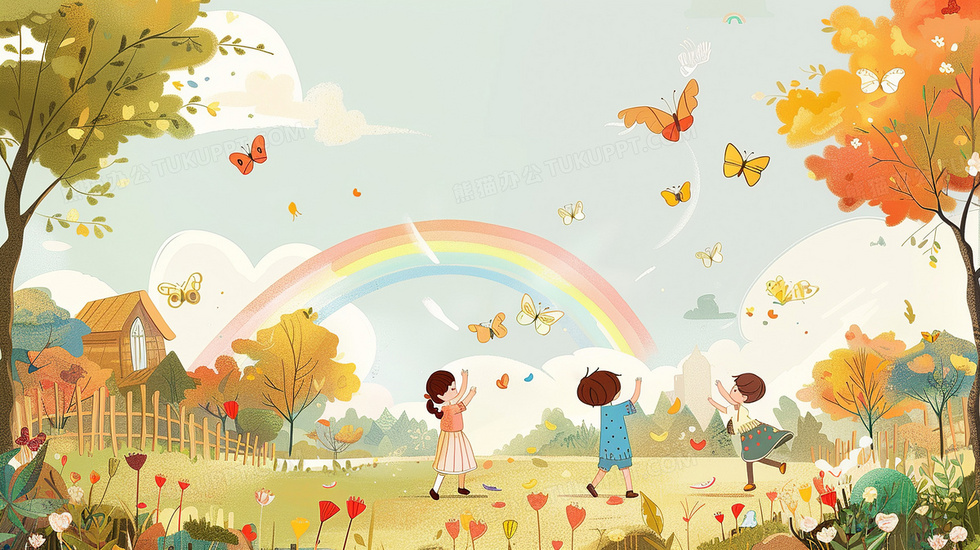 本作品内容为几个孩子儿童节在彩虹下花园里面草地上捉蝴蝶插画, 格式为 jpg, 大小4 MB, 图片尺寸为2912 x 1632, 源文件无水印, 欢迎使用熊猫办公。 如认为平台内容涉嫌侵权,可通过邮件:tousu@tukuppt.com提出书面通知,我们将及时处理。