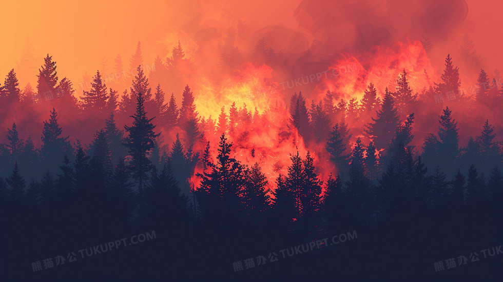 本作品内容为森林火灾自然灾害背景, 格式为 jpg, 大小3 MB, 图片尺寸为2912 x 1632, 作品中背景图片无需修改, 源文件无水印,可以直接使用, 欢迎使用熊猫办公。 如认为平台内容涉嫌侵权,可通过邮件:tousu@tukuppt.com提出书面通知,我们将及时处理。