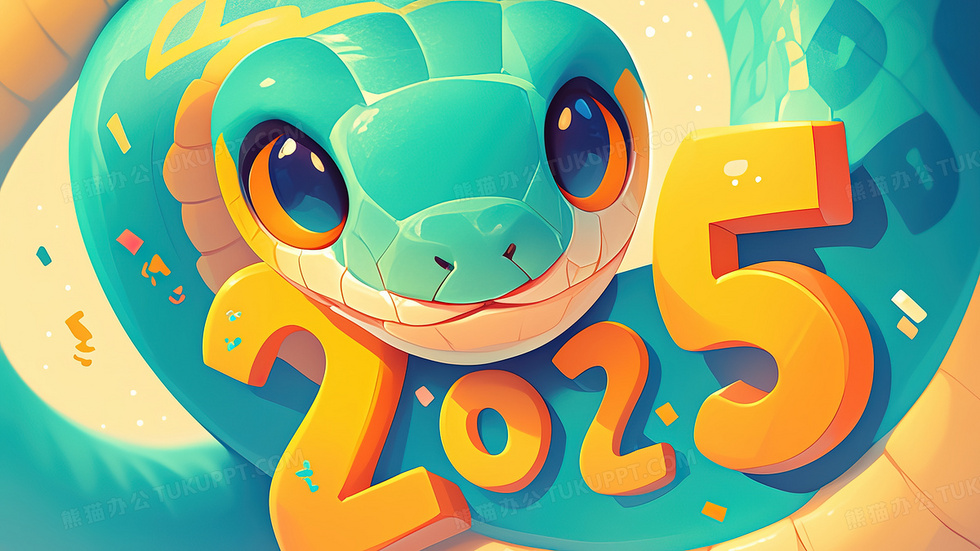 本作品内容为卡通蛇年数字2025创意新年插画, 格式为 jpg, 大小5 MB, 图片尺寸为2688 x 1512, 源文件无水印, 欢迎使用熊猫办公。 如认为平台内容涉嫌侵权,可通过邮件:tousu@tukuppt.com提出书面通知,我们将及时处理。