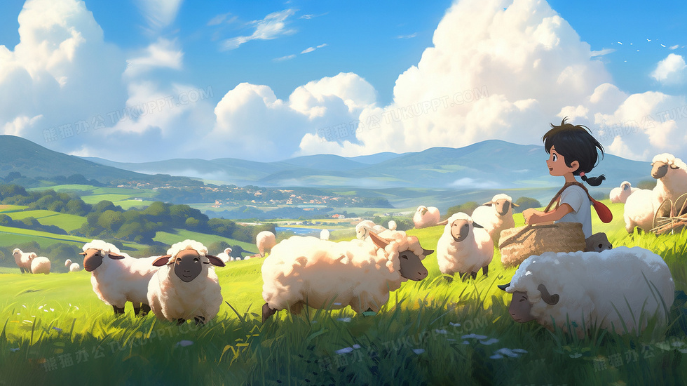 本作品内容为春天蓝天白云下男孩草地上放羊插画, 格式为 jpg, 大小3 MB, 图片尺寸为2912 x 1632, 源文件无水印, 欢迎使用熊猫办公。 如认为平台内容涉嫌侵权,可通过邮件:tousu@tukuppt.com提出书面通知,我们将及时处理。