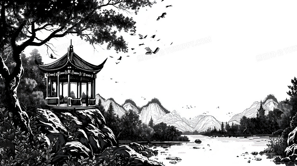本作品内容为黑白线描中国风建筑风景插画, 格式为 jpg, 大小3 MB, 图片尺寸为2912 x 1632, 源文件无水印, 欢迎使用熊猫办公。 如认为平台内容涉嫌侵权,可通过邮件:tousu@tukuppt.com提出书面通知,我们将及时处理。