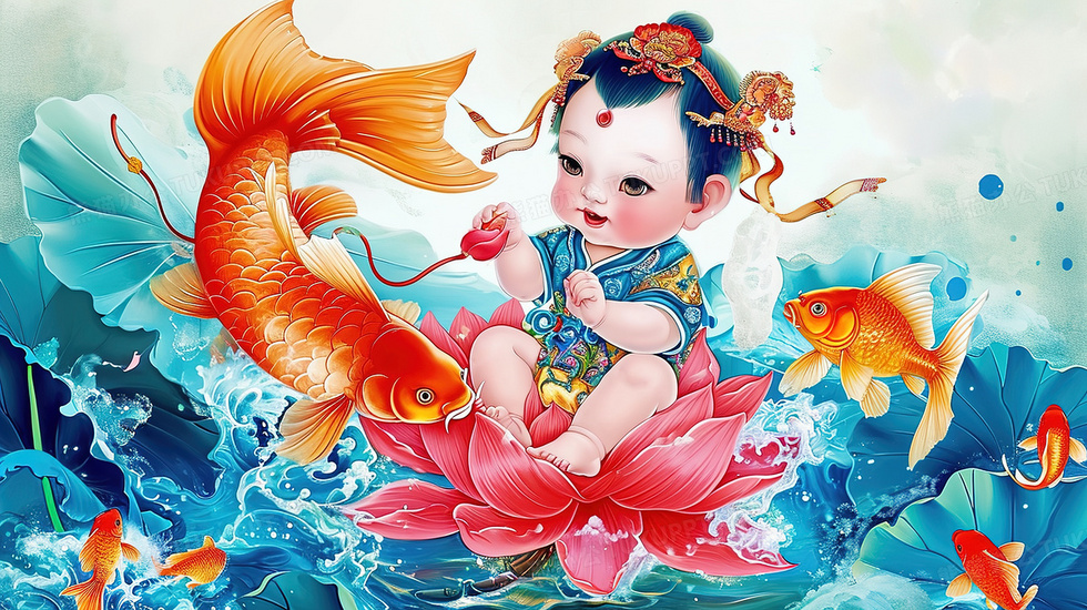首页 > 插画 > 科技艺术 > 国潮风 > 喜庆吉祥荷花锦鲤可爱的年画娃娃