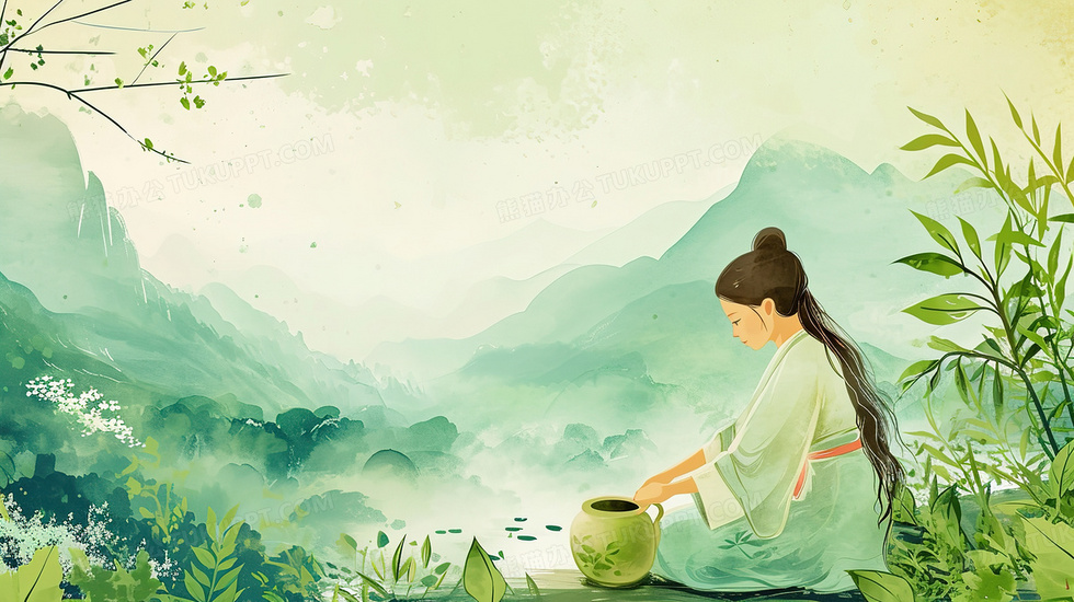 本作品内容为绿色少女山中饮茶插画, 格式为 jpg, 大小3 MB, 图片尺寸为2912 x 1632, 源文件无水印, 欢迎使用熊猫办公。 如认为平台内容涉嫌侵权,可通过邮件:tousu@tukuppt.com提出书面通知,我们将及时处理。