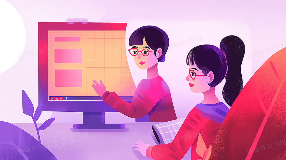 本作品内容为两位女生讨论电脑数据分析结果插画, 格式为 jpg, 大小3 MB, 图片尺寸为2912 x 1632, 源文件无水印, 欢迎使用熊猫办公。 如认为平台内容涉嫌侵权,可通过邮件:tousu@tukuppt.com提出书面通知,我们将及时处理。