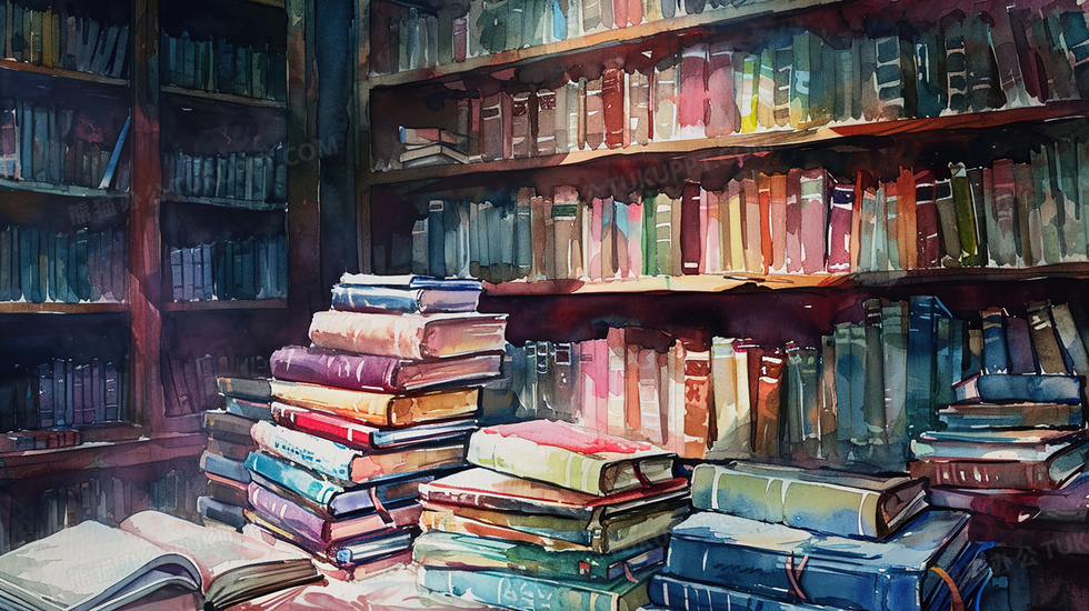 本作品内容为彩色水彩质感书籍摆放插画, 格式为 jpg, 大小4 MB, 图片尺寸为2912 x 1632, 源文件无水印, 欢迎使用熊猫办公。 如认为平台内容涉嫌侵权,可通过邮件:tousu@tukuppt.com提出书面通知,我们将及时处理。