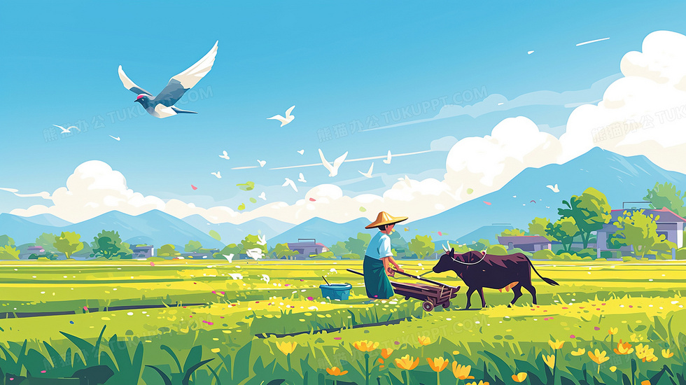 本作品内容为蓝天白云农民耕田犁地小满风景插画, 格式为 jpg, 大小3 MB, 图片尺寸为2912 x 1632, 源文件无水印, 欢迎使用熊猫办公。 如认为平台内容涉嫌侵权,可通过邮件:tousu@tukuppt.com提出书面通知,我们将及时处理。