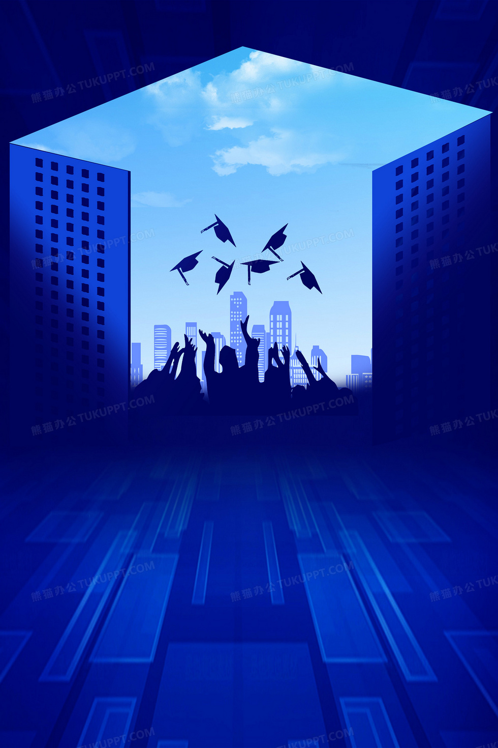 本作品内容为创意蓝色毕业季学生剪影背景, 格式为 psd, 大小29 MB, 图片尺寸为3543 x 5315, 作品中背景图片无需修改, 源文件无水印,可以直接使用, 欢迎使用熊猫办公。 如认为平台内容涉嫌侵权,可通过邮件:tousu@tukuppt.com提出书面通知,我们将及时处理。