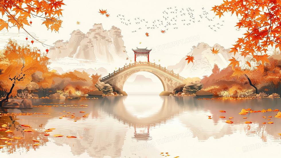 本作品内容为唯美秋季枫叶中国风拱桥插画, 格式为 jpg, 大小4 MB, 图片尺寸为2912 x 1632, 源文件无水印, 欢迎使用熊猫办公。 如认为平台内容涉嫌侵权,可通过邮件:tousu@tukuppt.com提出书面通知,我们将及时处理。
