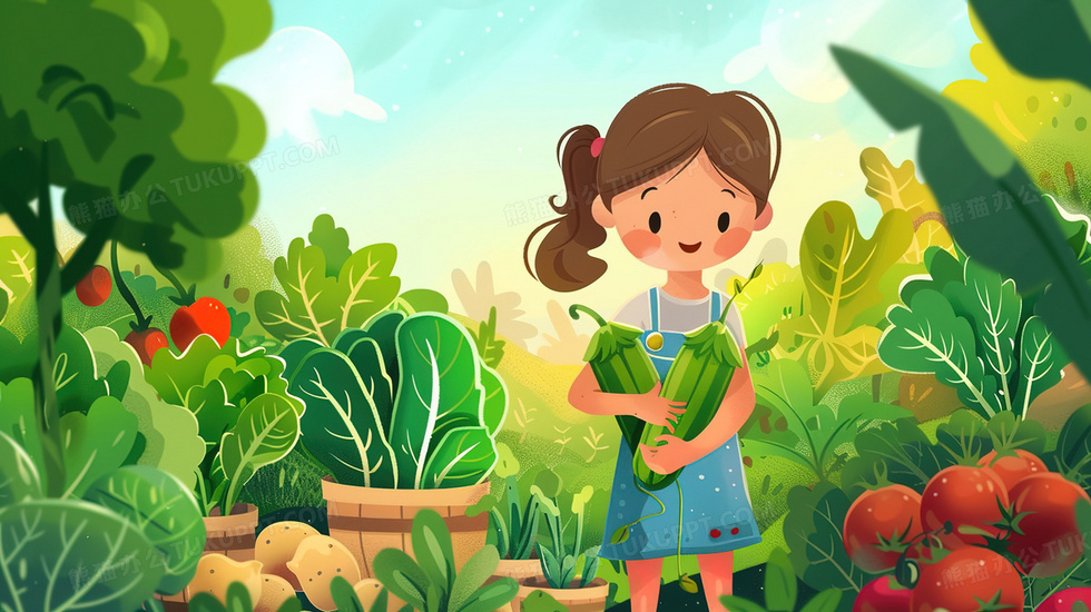 本作品内容为绿色卡通收获蔬菜的女孩插画, 格式为 jpg, 大小3 MB, 图片尺寸为2912 x 1632, 源文件无水印, 欢迎使用熊猫办公。 如认为平台内容涉嫌侵权,可通过邮件:tousu@tukuppt.com提出书面通知,我们将及时处理。