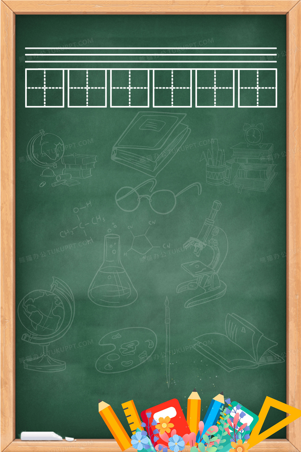 本作品内容为卡通风田字格黑板创意背景, 格式为 psd, 大小39 MB, 图片尺寸为3543 x 5315, 作品中背景图片无需修改, 源文件无水印,可以直接使用, 欢迎使用熊猫办公。 如认为平台内容涉嫌侵权,可通过邮件:tousu@tukuppt.com提出书面通知,我们将及时处理。