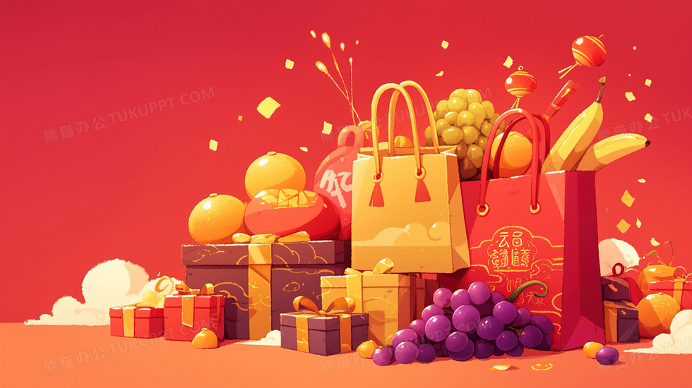 本作品内容为卡通新年礼盒水果红色背景, 格式为 jpg, 大小2 MB, 图片尺寸为2912 x 1632, 作品中背景图片无需修改, 源文件无水印,可以直接使用, 欢迎使用熊猫办公。 如认为平台内容涉嫌侵权,可通过邮件:tousu@tukuppt.com提出书面通知,我们将及时处理。