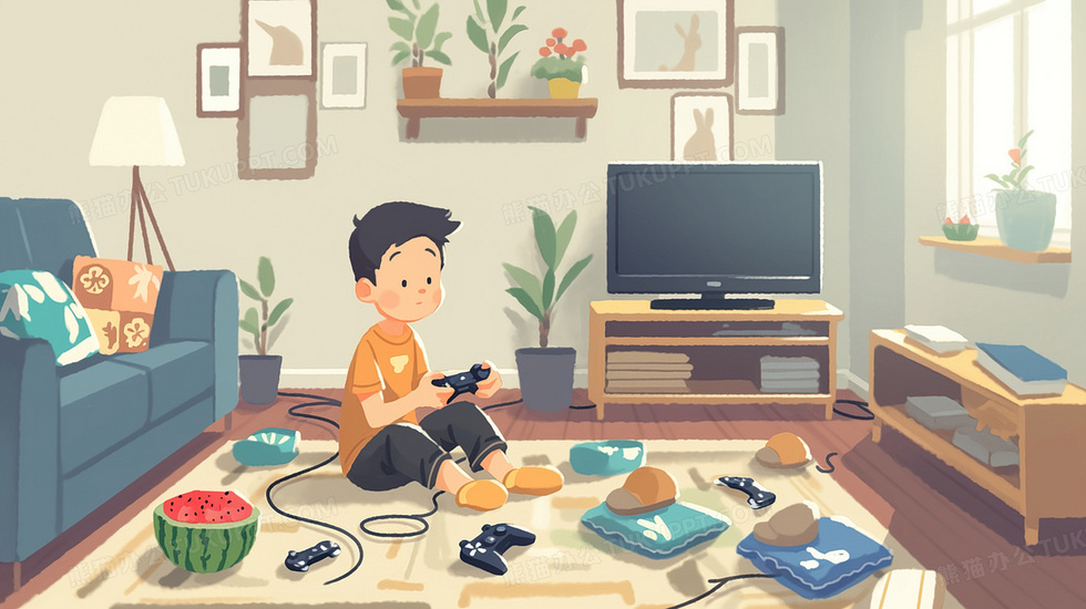 本作品内容为手拿游戏手柄玩游戏的卡通男孩插画, 格式为 jpg, 大小2 MB, 图片尺寸为2912 x 1632, 源文件无水印, 欢迎使用熊猫办公。 如认为平台内容涉嫌侵权,可通过邮件:tousu@tukuppt.com提出书面通知,我们将及时处理。