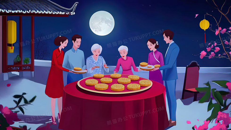 本作品内容为中秋圆月下吃月饼的一家人插画, 格式为 jpg, 大小3 MB, 图片尺寸为2912 x 1632, 源文件无水印, 欢迎使用熊猫办公。 如认为平台内容涉嫌侵权,可通过邮件:tousu@tukuppt.com提出书面通知,我们将及时处理。