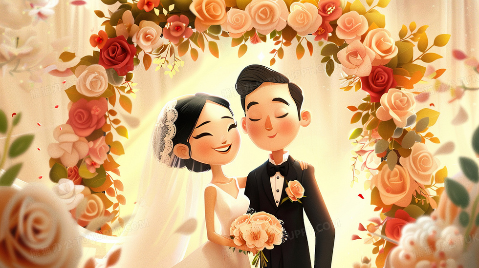 本作品内容为玫瑰花浪漫婚礼结婚卡通插画, 格式为 jpg, 大小4 MB, 图片尺寸为2912 x 1632, 源文件无水印, 欢迎使用熊猫办公。 如认为平台内容涉嫌侵权,可通过邮件:tousu@tukuppt.com提出书面通知,我们将及时处理。