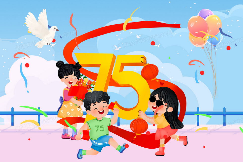 本作品内容为孩子快乐庆祝国庆节75周年插画, 格式为 psd, 大小20 MB, 请使用软件PhotoShop(CC)打开, 源文件无水印, 欢迎使用熊猫办公。 如认为平台内容涉嫌侵权,可通过邮件:tousu@tukuppt.com提出书面通知,我们将及时处理。