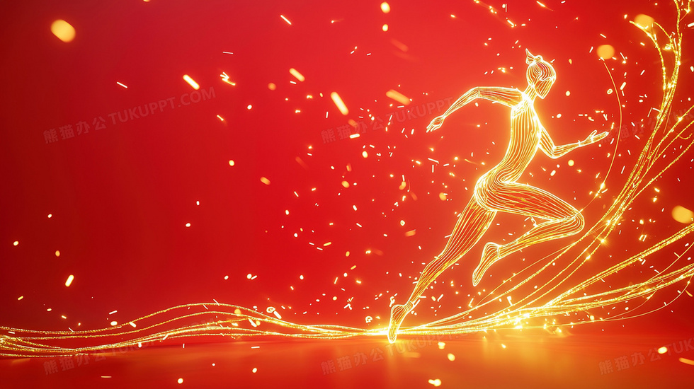 本作品内容为红色大气金色粒子奔跑的人物创意背景, 格式为 jpg, 大小2 MB, 图片尺寸为2912 x 1632, 作品中背景图片无需修改, 源文件无水印,可以直接使用, 欢迎使用熊猫办公。 如认为平台内容涉嫌侵权,可通过邮件:tousu@tukuppt.com提出书面通知,我们将及时处理。