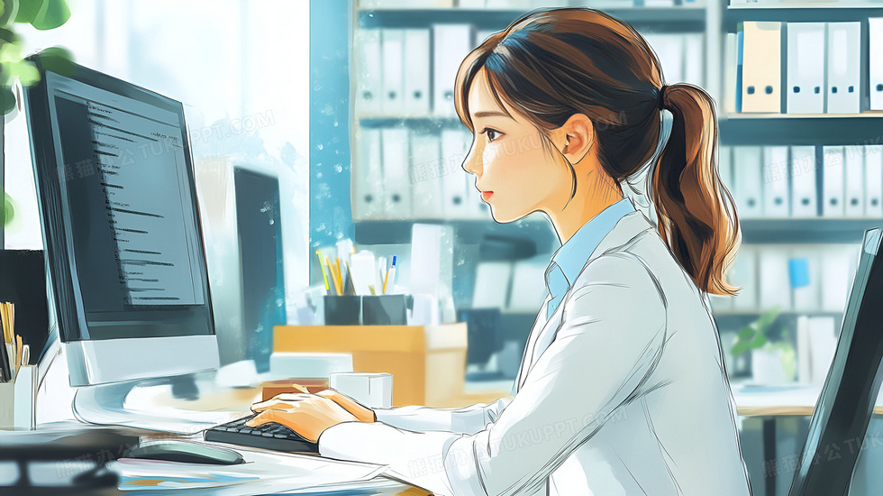 本作品内容为一个正在办公的女白领插画, 格式为 jpg, 大小1 MB, 图片尺寸为2912 x 1632, 源文件无水印, 欢迎使用熊猫办公。 如认为平台内容涉嫌侵权,可通过邮件:tousu@tukuppt.com提出书面通知,我们将及时处理。