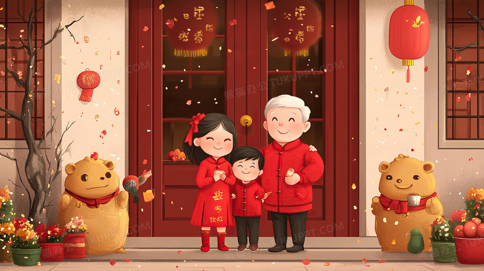 本作品内容为喜庆新年家人走亲戚拜年插画, 格式为 jpg, 大小3 MB, 图片尺寸为2912 x 1632, 源文件无水印, 欢迎使用熊猫办公。 如认为平台内容涉嫌侵权,可通过邮件:tousu@tukuppt.com提出书面通知,我们将及时处理。