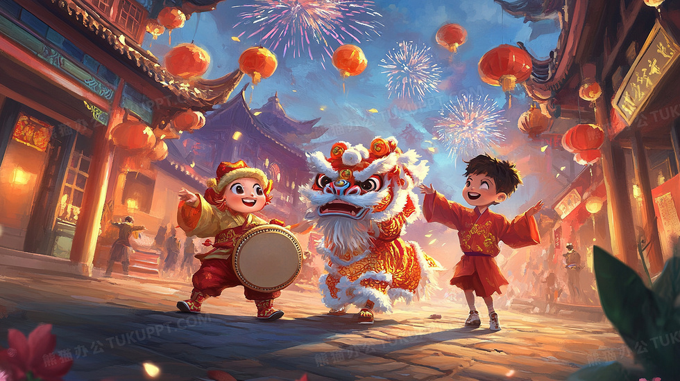本作品内容为孩子舞狮迎新春新年喜庆插画, 格式为 jpg, 大小4 MB, 图片尺寸为2912 x 1632, 源文件无水印, 欢迎使用熊猫办公。 如认为平台内容涉嫌侵权,可通过邮件:tousu@tukuppt.com提出书面通知,我们将及时处理。