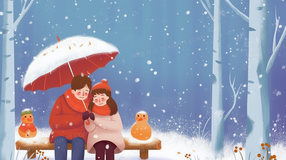 本作品内容为冬日森林中一对情侣举着伞坐在长椅上赏雪插画, 格式为 jpg, 大小7 MB, 图片尺寸为2912 x 1632, 源文件无水印, 欢迎使用熊猫办公。 如认为平台内容涉嫌侵权,可通过邮件:tousu@tukuppt.com提出书面通知,我们将及时处理。