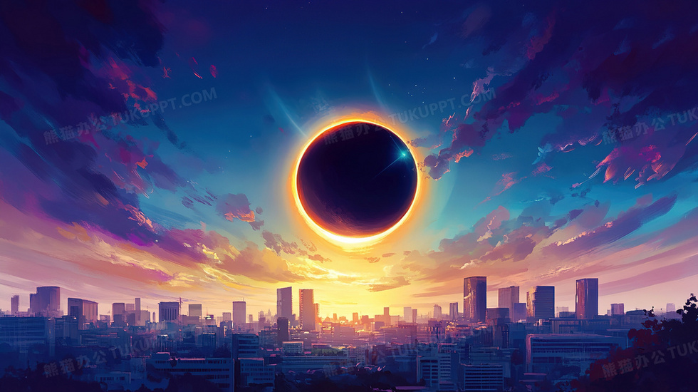本作品内容为自然界自然现象城市高空日食插画, 格式为 jpg, 大小3 MB, 图片尺寸为2912 x 1632, 源文件无水印, 欢迎使用熊猫办公。 如认为平台内容涉嫌侵权,可通过邮件:tousu@tukuppt.com提出书面通知,我们将及时处理。