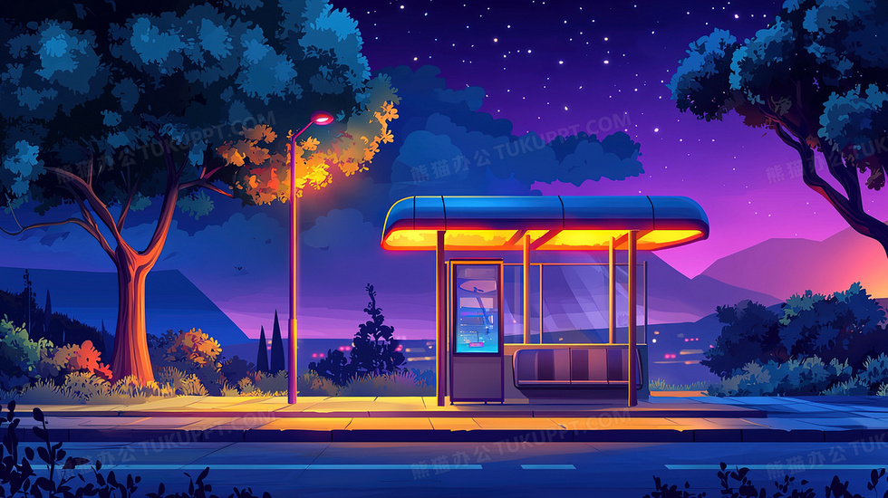 本作品内容为夜晚城市道路公交车站牌插画, 格式为 jpg, 大小3 MB, 图片尺寸为2912 x 1632, 源文件无水印, 欢迎使用熊猫办公。 如认为平台内容涉嫌侵权,可通过邮件:tousu@tukuppt.com提出书面通知,我们将及时处理。