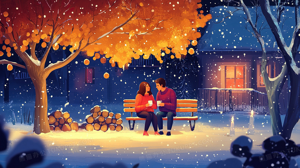 本作品内容为冬季雪地取暖情侣插画, 格式为 jpg, 大小4 MB, 图片尺寸为2912 x 1632, 源文件无水印, 欢迎使用熊猫办公。 如认为平台内容涉嫌侵权,可通过邮件:tousu@tukuppt.com提出书面通知,我们将及时处理。