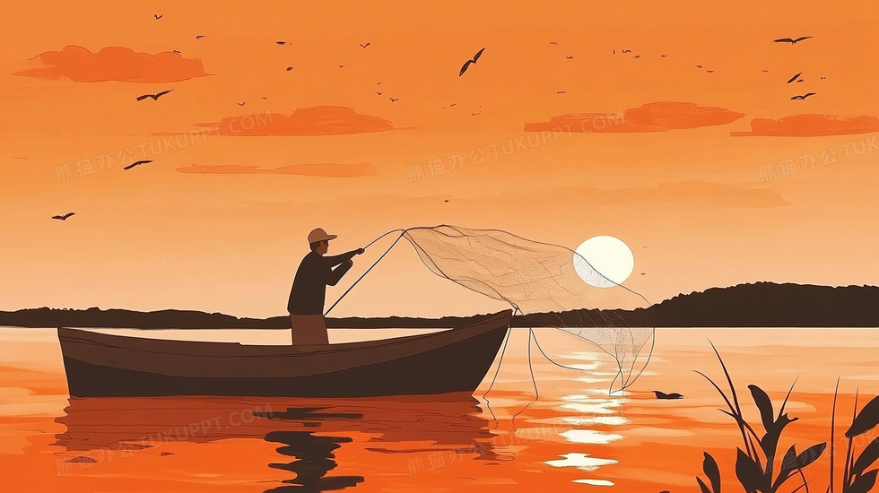 本作品内容为日出日落渔业渔民船只出海捕鱼插画, 格式为 jpg, 大小2 MB, 图片尺寸为2912 x 1632, 源文件无水印, 欢迎使用熊猫办公。 如认为平台内容涉嫌侵权,可通过邮件:tousu@tukuppt.com提出书面通知,我们将及时处理。