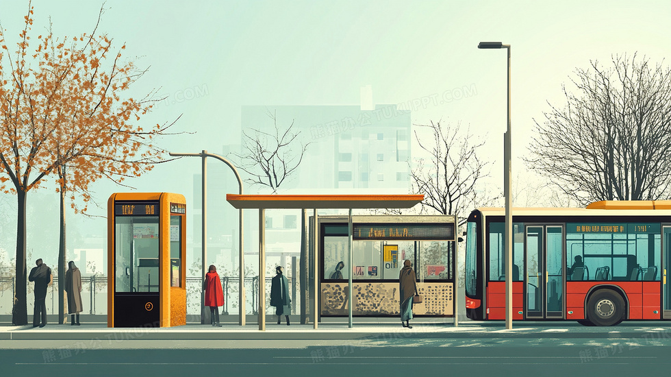 本作品内容为公交车站城市交通出行插画, 格式为 jpg, 大小3 MB, 图片尺寸为2912 x 1632, 源文件无水印, 欢迎使用熊猫办公。 如认为平台内容涉嫌侵权,可通过邮件:tousu@tukuppt.com提出书面通知,我们将及时处理。