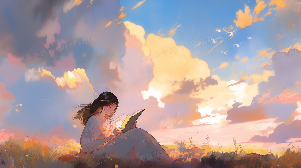 本作品内容为女孩在绚丽多彩的天空下看书插画, 格式为 jpg, 大小6 MB, 图片尺寸为2912 x 1632, 源文件无水印, 欢迎使用熊猫办公。 如认为平台内容涉嫌侵权,可通过邮件:tousu@tukuppt.com提出书面通知,我们将及时处理。