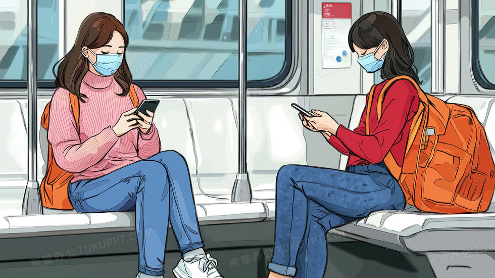 本作品内容为坐地铁戴口罩玩手机的两个女孩插画, 格式为 jpg, 大小3 MB, 图片尺寸为2912 x 1632, 源文件无水印, 欢迎使用熊猫办公。 如认为平台内容涉嫌侵权,可通过邮件:tousu@tukuppt.com提出书面通知,我们将及时处理。