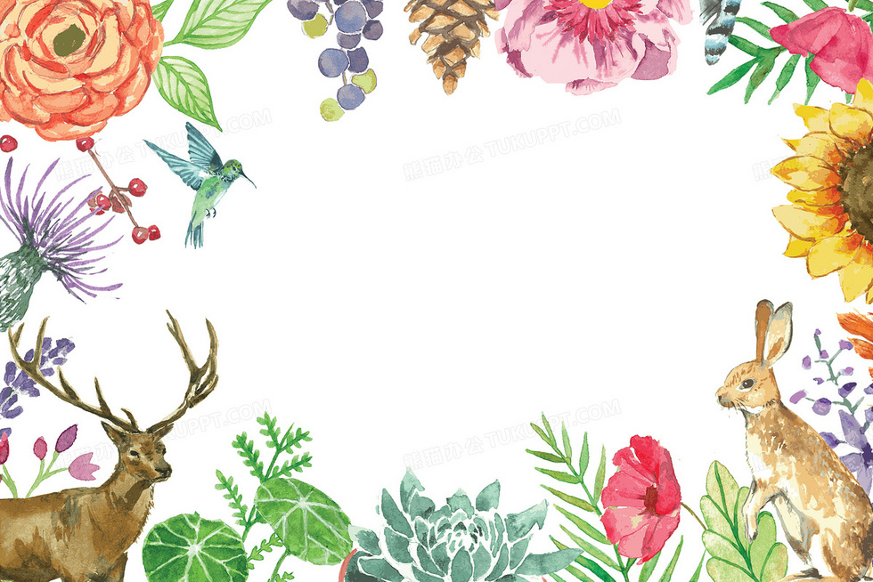 本作品内容为手绘水彩小动物花卉卡片背景, 格式为 psd, 图片尺寸为3000 x 2002, 作品中背景图片无需修改, 源文件无水印,可以直接使用, 欢迎使用熊猫办公。 如认为平台内容涉嫌侵权,可通过邮件:tousu@tukuppt.com提出书面通知,我们将及时处理。