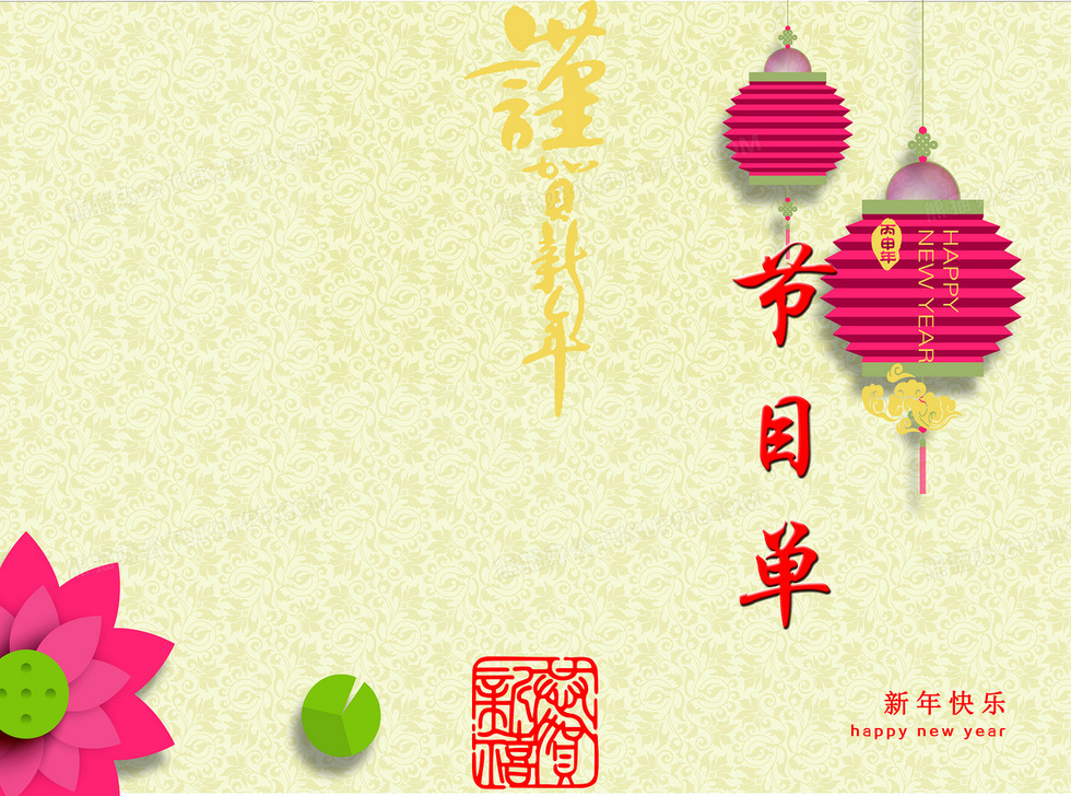 本作品内容为背景灯笼莲花花色底纹新年节目单, 格式为 psd, 图片尺寸为3437 x 2551, 作品中背景图片无需修改, 源文件无水印,可以直接使用, 欢迎使用熊猫办公。 如认为平台内容涉嫌侵权,可通过邮件:tousu@tukuppt.com提出书面通知,我们将及时处理。
