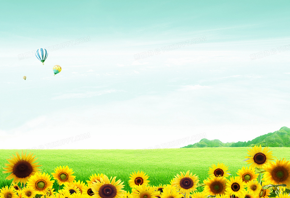 本作品内容为清新蓝天白云绿草地向日葵热气球海报背景, 格式为 psd, 图片尺寸为5031 x 3437, 作品中背景图片无需修改, 源文件无水印,可以直接使用, 欢迎使用熊猫办公。 如认为平台内容涉嫌侵权,可通过邮件:tousu@tukuppt.com提出书面通知,我们将及时处理。