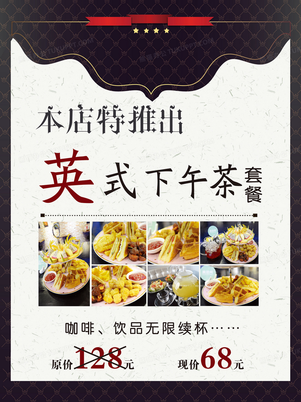 本作品内容为西餐厅英式下午茶海报素材, 格式为 psd, 图片尺寸为3307 x 4409, 作品中背景图片无需修改, 源文件无水印,可以直接使用, 欢迎使用熊猫办公。 如认为平台内容涉嫌侵权,可通过邮件:tousu@tukuppt.com提出书面通知,我们将及时处理。