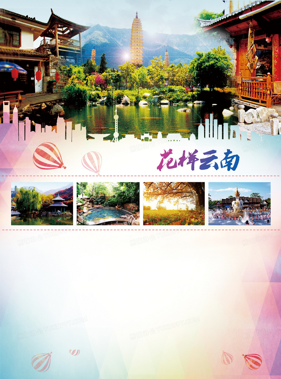 本作品内容为云南建筑旅游背景模板, 格式为 psd, 图片尺寸为2551 x 3437, 作品中背景图片无需修改, 源文件无水印,可以直接使用, 欢迎使用熊猫办公。 如认为平台内容涉嫌侵权,可通过邮件:tousu@tukuppt.com提出书面通知,我们将及时处理。