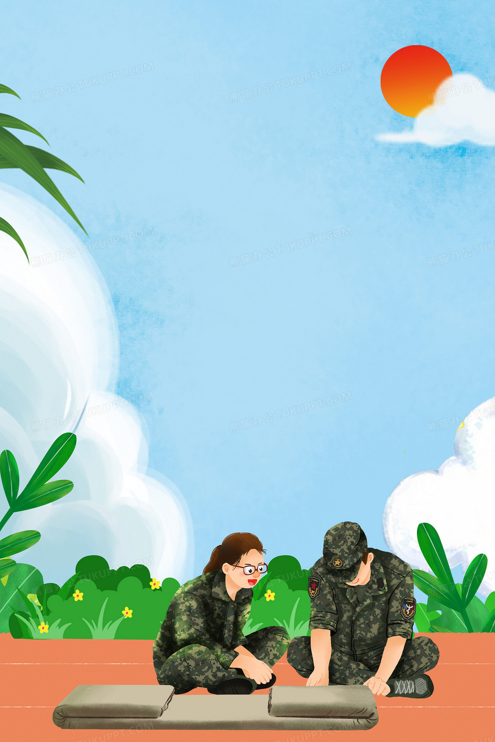 本作品内容为手绘插画风军训叠被子背景, 格式为 psd, 大小130 MB, 图片尺寸为3543 x 5314, 作品中背景图片无需修改, 源文件无水印,可以直接使用, 欢迎使用熊猫办公。 如认为平台内容涉嫌侵权,可通过邮件:tousu@tukuppt.com提出书面通知,我们将及时处理。