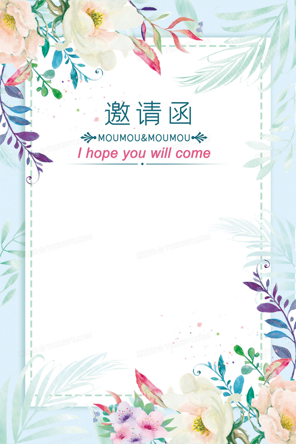 本作品内容为小清新花卉婚礼邀请函背景, 格式为 psd, 大小106 MB, 图片尺寸为3544 x 5316, 作品中背景图片无需修改, 源文件无水印,可以直接使用, 欢迎使用熊猫办公。 如认为平台内容涉嫌侵权,可通过邮件:tousu@tukuppt.com提出书面通知,我们将及时处理。
