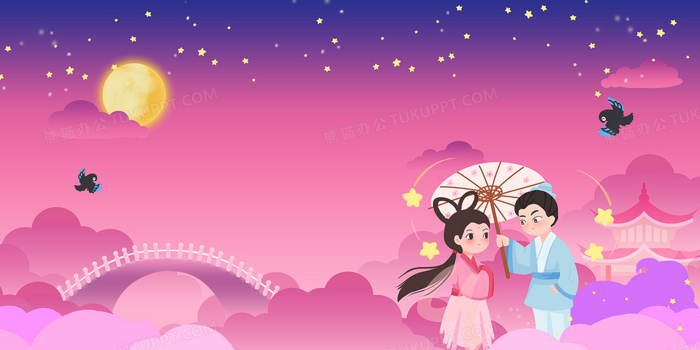 本作品内容为七夕情人节牛郎织女喜鹊鹊桥卡通背景, 格式为 psd, 大小4 MB, 图片尺寸为4724 x 2362, 作品中背景图片无需修改, 源文件无水印,可以直接使用, 欢迎使用熊猫办公。 如认为平台内容涉嫌侵权,可通过邮件:tousu@tukuppt.com提出书面通知,我们将及时处理。