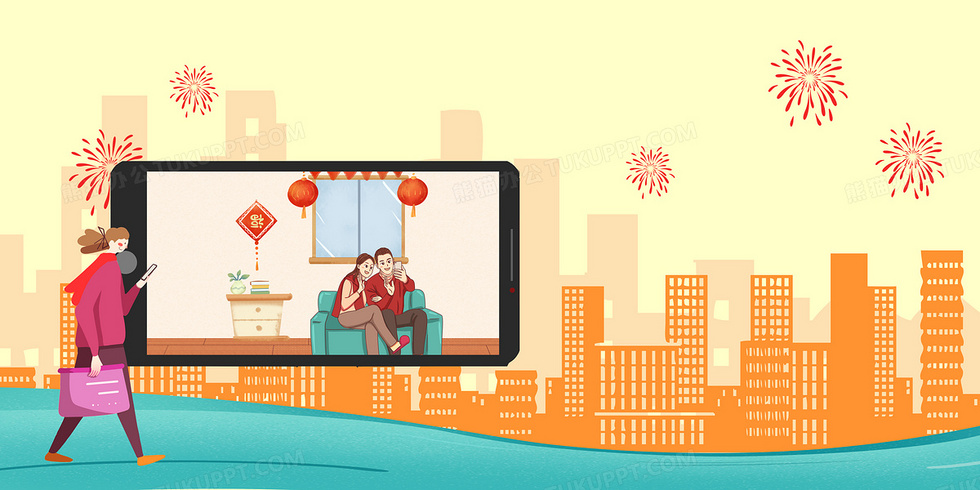 本作品内容为疫情防控过年不回家视频拜年背景, 格式为 psd, 大小8 MB, 图片尺寸为4724 x 2362, 作品中背景图片无需修改, 源文件无水印,可以直接使用, 欢迎使用熊猫办公。 如认为平台内容涉嫌侵权,可通过邮件:tousu@tukuppt.com提出书面通知,我们将及时处理。