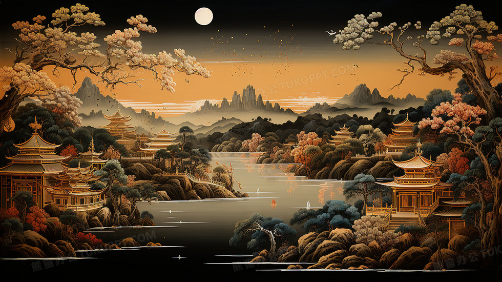 本作品内容为中式中国风古代建筑秋天山水风景插画, 格式为 jpg, 大小10 MB, 图片尺寸为2912 x 1632, 源文件无水印, 欢迎使用熊猫办公。 如认为平台内容涉嫌侵权,可通过邮件:tousu@tukuppt.com提出书面通知,我们将及时处理。