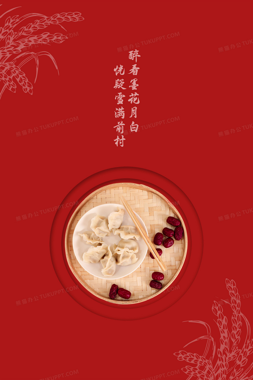 本作品内容为立冬吃饺子红色古诗节气背景, 格式为 psd, 大小51 MB, 图片尺寸为3543 x 5315, 作品中背景图片无需修改, 源文件无水印,可以直接使用, 欢迎使用熊猫办公。 如认为平台内容涉嫌侵权,可通过邮件:tousu@tukuppt.com提出书面通知,我们将及时处理。