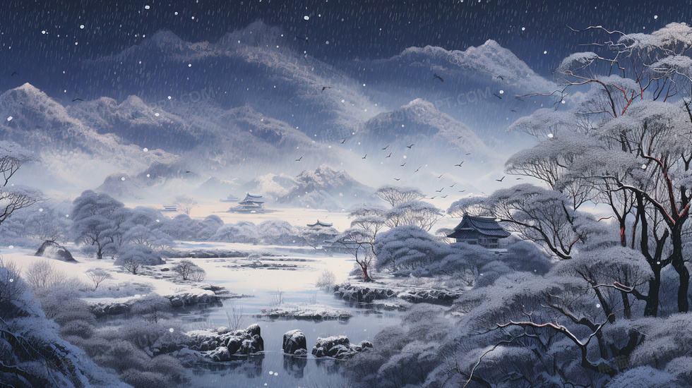 本作品内容为中国风纯净雪中山水风景树木插画, 格式为 jpg, 大小8 MB, 图片尺寸为2912 x 1632, 源文件无水印, 欢迎使用熊猫办公。 如认为平台内容涉嫌侵权,可通过邮件:tousu@tukuppt.com提出书面通知,我们将及时处理。
