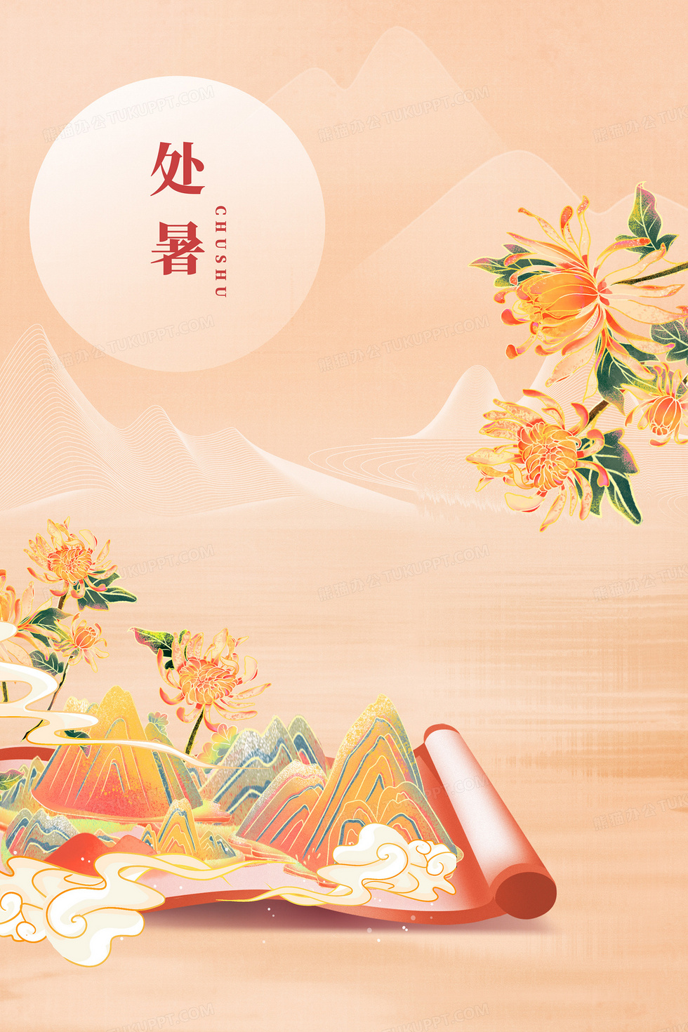 本作品内容为二十四节气之处暑菊花山水卷轴背景, 格式为 psd, 大小103 MB, 图片尺寸为3543 x 5314, 作品中背景图片无需修改, 源文件无水印,可以直接使用, 欢迎使用熊猫办公。 如认为平台内容涉嫌侵权,可通过邮件:tousu@tukuppt.com提出书面通知,我们将及时处理。
